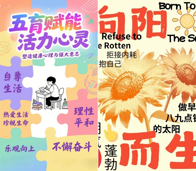 心理健康主题海报征集活动中,同学们以图文并茂的方式展示了心理健康宣传相关知识,有人以温暖的向日葵为元素,寓意积极向阳的心态;有人用抽象的几何图形组合,表达内心世界的复杂与坚韧,创意丰富,形式多样,将心理健康知识内化于心,外践于行。