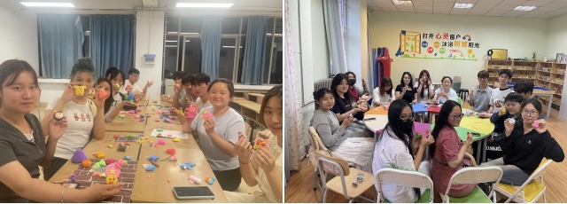 团体心理辅导--黏土捏捏乐手工DIY活动中,同学们互相交流技巧,将五彩斑斓的黏土变成小动物、花朵、沙滩等各具特色的DIY小物件,并将自己的作品进行展示,讲述创作背后的故事与心情,收获彼此的掌声与鼓励。