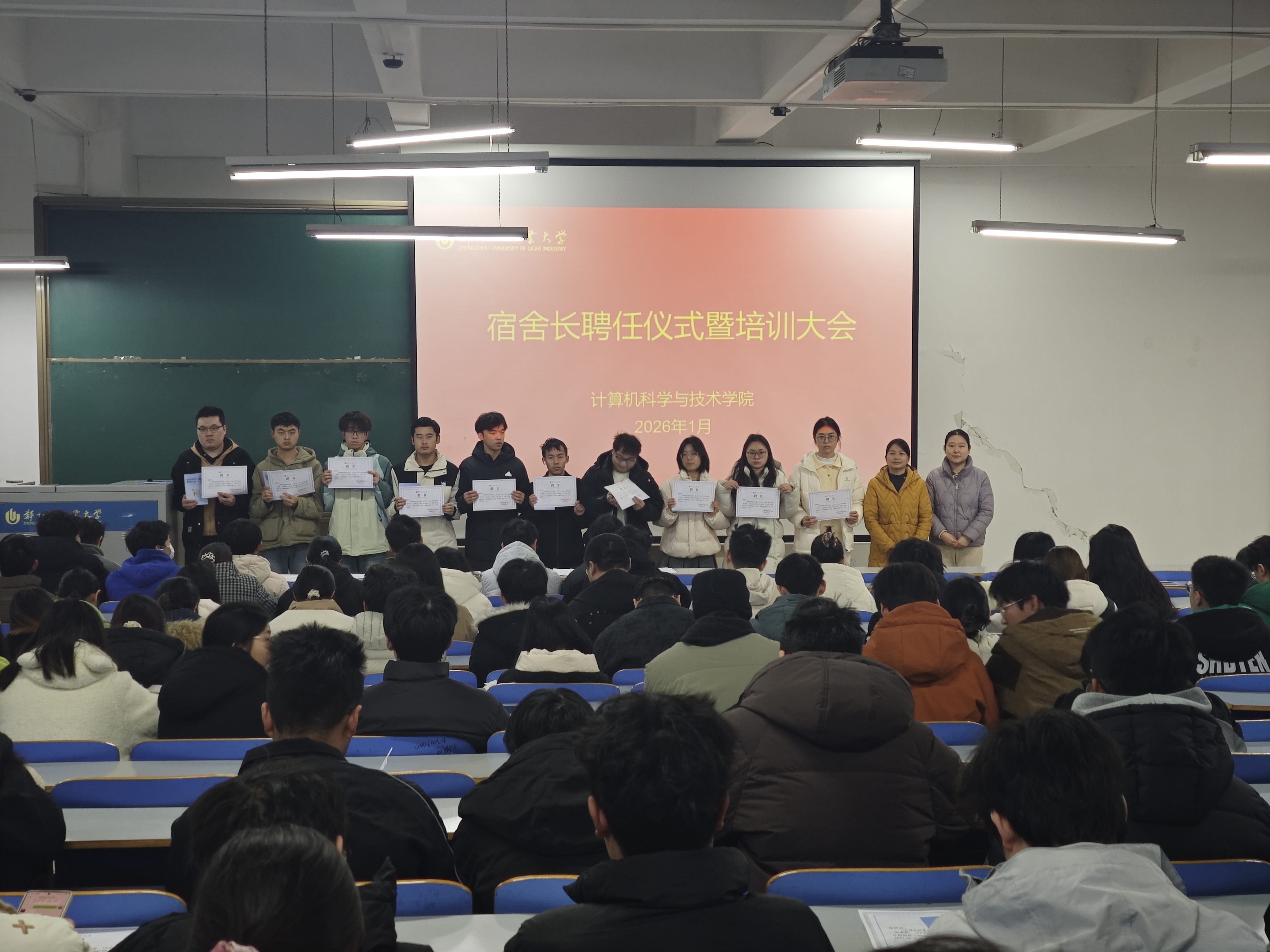 为进一步加强宿舍管理,提升宿舍长责任意识与履职能力,1月9日上午,计算机科学与技术学院在计算机楼118室召开科学校区宿舍长聘任仪式暨培训大会,学院辅导员和科学校区全体宿舍长参加会议。 会上,学院学工办主任李一蕾首先介绍了本次宿舍长聘任与培训会的工作背景与整体安排,围绕安全教育与防诈骗专题,通过案例剖析、视频演示等形式,系统分析了宿舍常见安全隐患及各类诈骗手段,结合实际传授了相应的防范策略与应对技能。她还结合近期校园安全动态,提醒各宿舍长务必保持高度警惕,及时上报异常情况,共同维护宿舍环境的安全稳定,推动形成互帮互助、共同进步的良好舍风。学院党委副书记刘放美强调,宿舍长作为学生自治体系中的重要力量,不仅应切实履行卫生监督、作息协调与矛盾调解等基础职责,更应在学风建设中发挥引领作用,率先垂范,积极营造勤奋向上、团结协作的宿舍文化氛围。最后,学院老师一起为宿舍长颁发聘书,并合影留念。 此次会议进一步明确了宿舍长的职责定位,强化了学生自我管理与协同育人的工作机制,为学院营造安全有序、学风优良的宿舍环境提供了有力支撑。 |